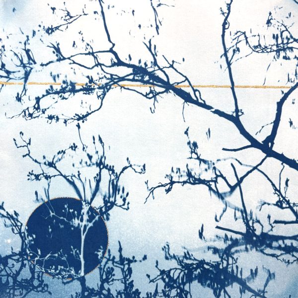 Framed original cyanotype on conservation quality 300gsm watercolour paper, with gold metal leaf detail. Presented in a white conservation quality mount with white wooden frame.